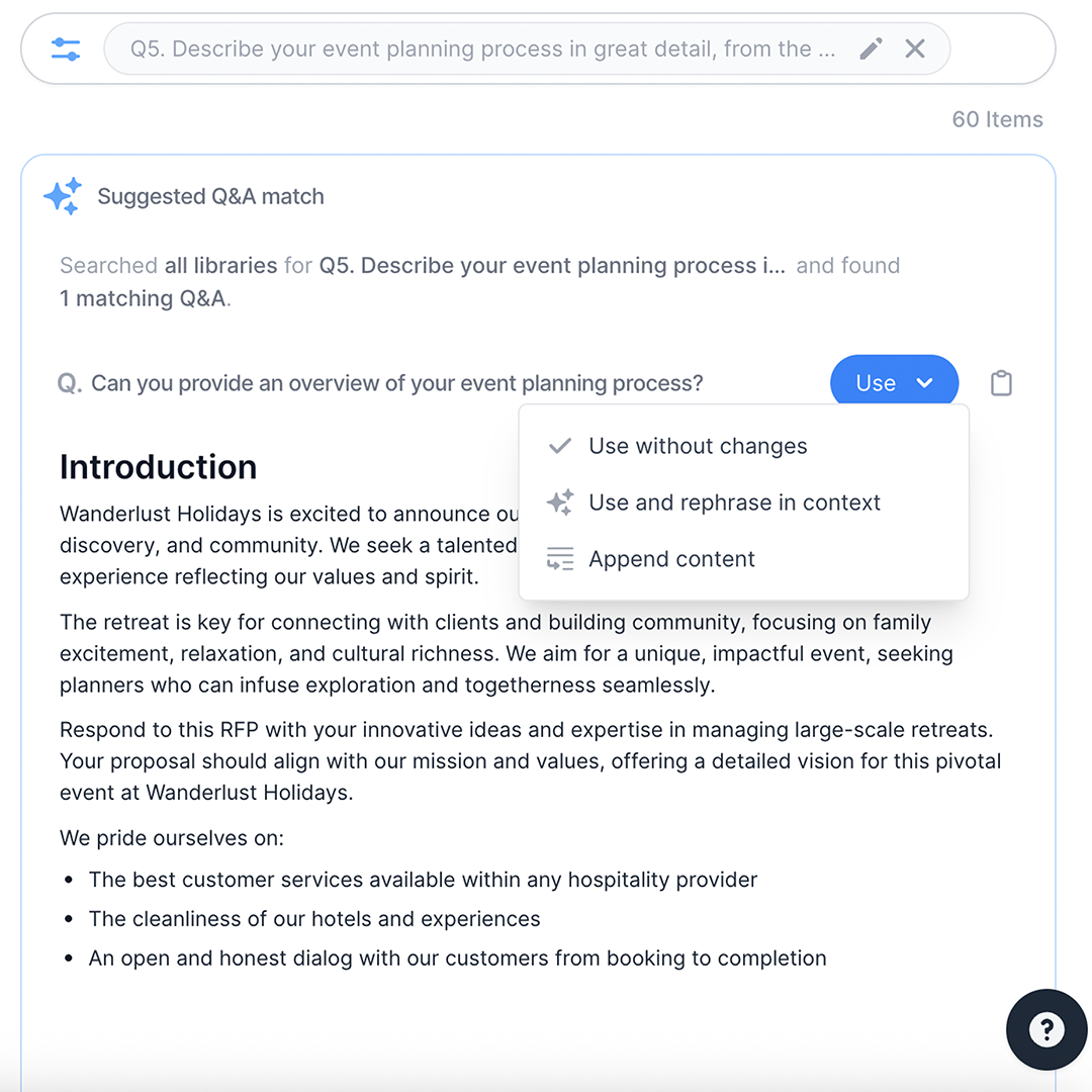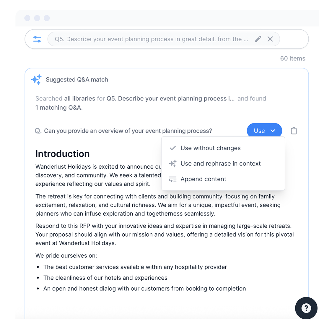 Every response is sourced from verified documents and controlled by your content governance rules. You have full visibility before anything is approved or exported.