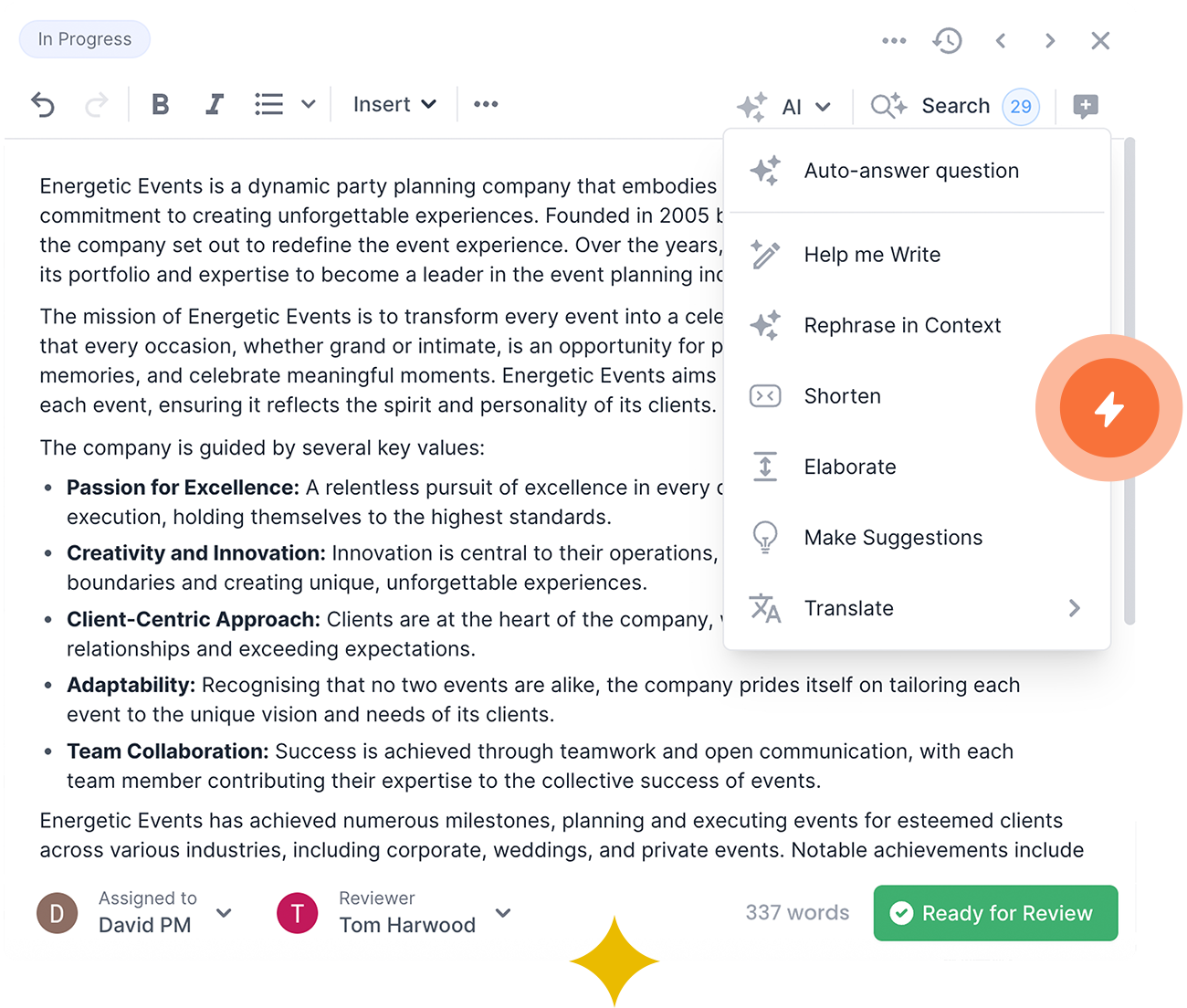 The AI Writing Assistant uses your approved content and context from past bids to generate new responses — ensuring every word is accurate and aligned with your organisation’s tone and standards.
