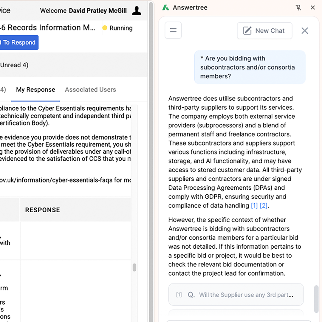 You can use it wherever you work, whether you’re in a supplier portal, completing an RFP, or drafting a proposal in Word or Excel. The Chrome extension allows you to pull answers in real time, while the in-platform chat gives you the same speed and accuracy from within Answertree itself.