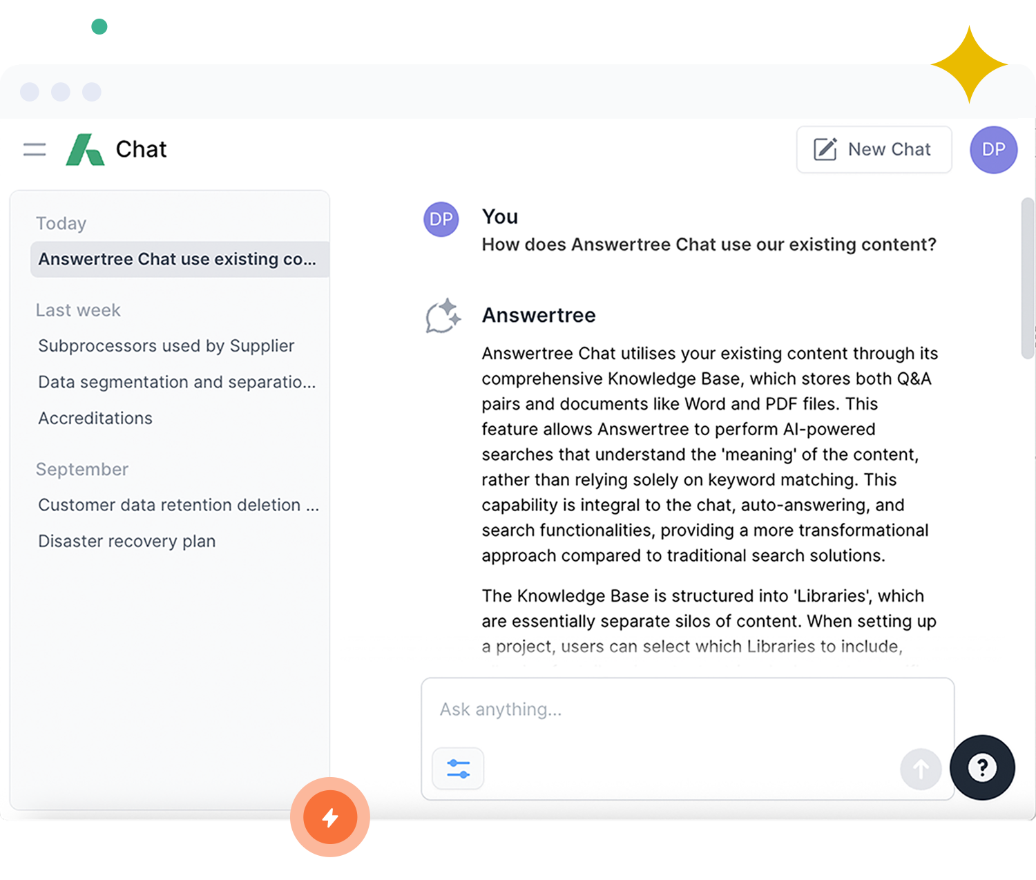 Answertree Chat lets you access verified answers directly from your company’s knowledge base, either through the Chrome extension or inside the platform. Simply highlight or type a question, and the AI retrieves the most relevant approved content instantly, without switching tabs or searching manually.