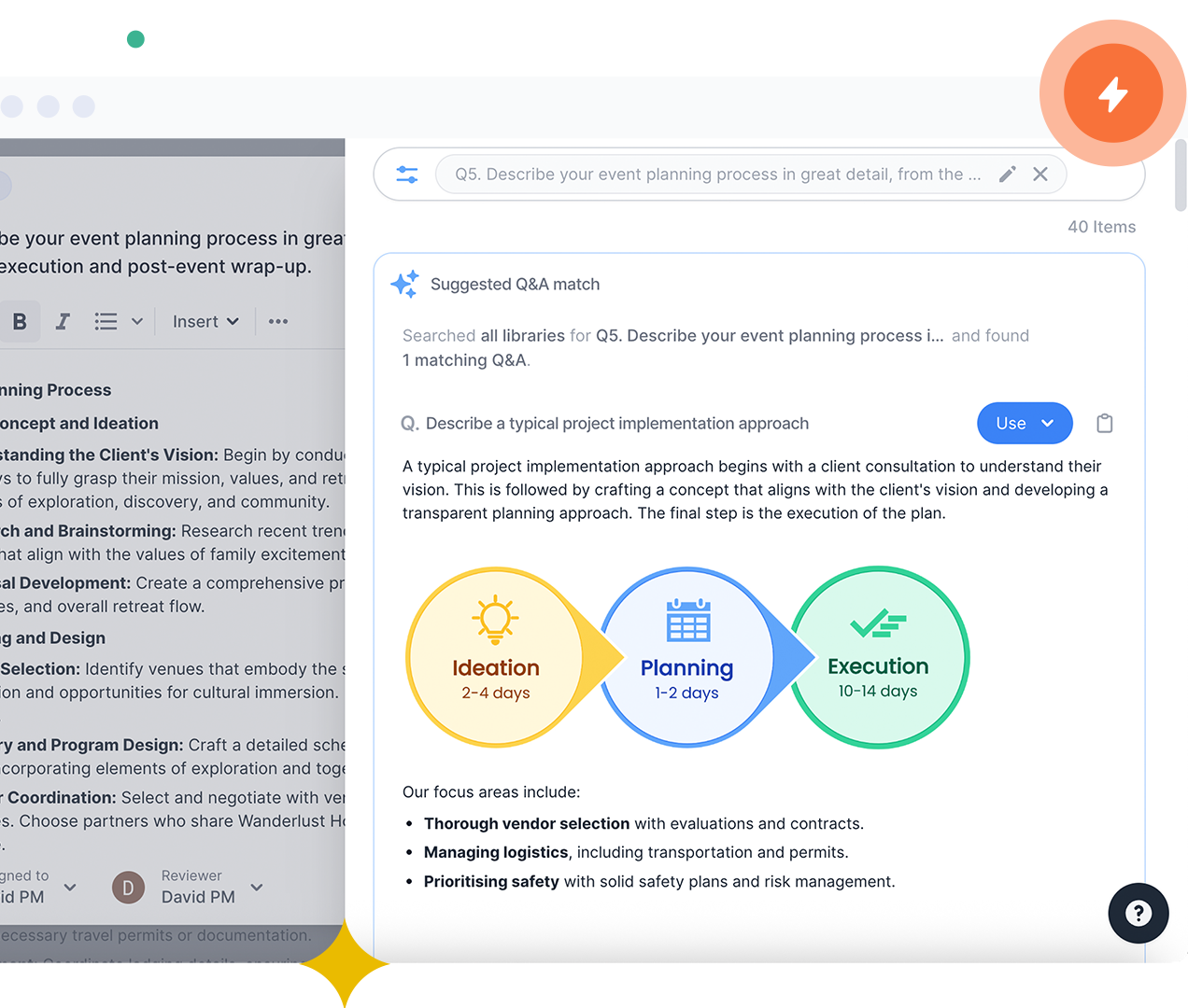 Your approved libraries, past bids and templates, plus connected sources like SharePoint, Google Drive and internal wikis/web pages (when enabled).